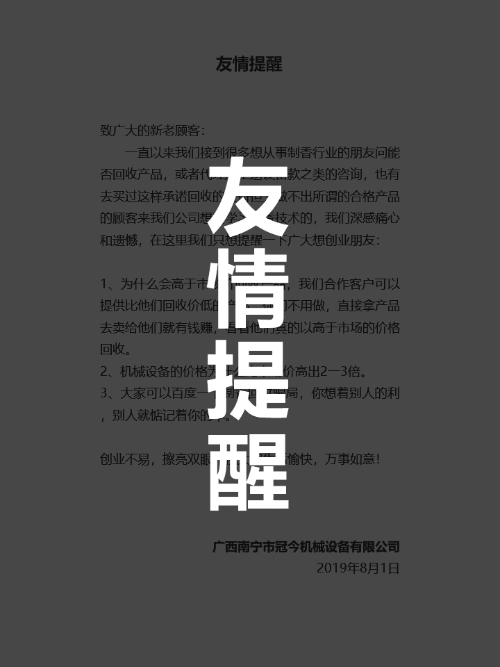 購買冠今制香機,享受八大保證,讓您創(chuàng)業(yè)無憂!冠今制香機八大支持保證系統(tǒng):強力支持 后顧無憂 1.現(xiàn)場觀摩:免費在制香廠里參觀各種香生產(chǎn)流程,滿意后再做決定。 2.專業(yè)培訓(xùn):購制香機...